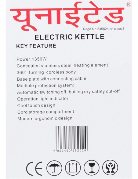 United Electric Kettle 1.5 Litre Red (Inside Steel Body & Wire Length 69 cm)